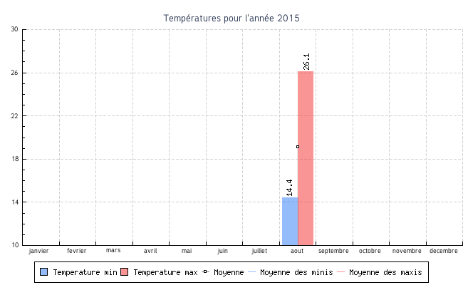 | aout | 14.4 °C | 15.5 °C | 26.1 °C | 24.7 °C | 19.1 °C | 1.2 km/h | 26.3 km/h | NNO |